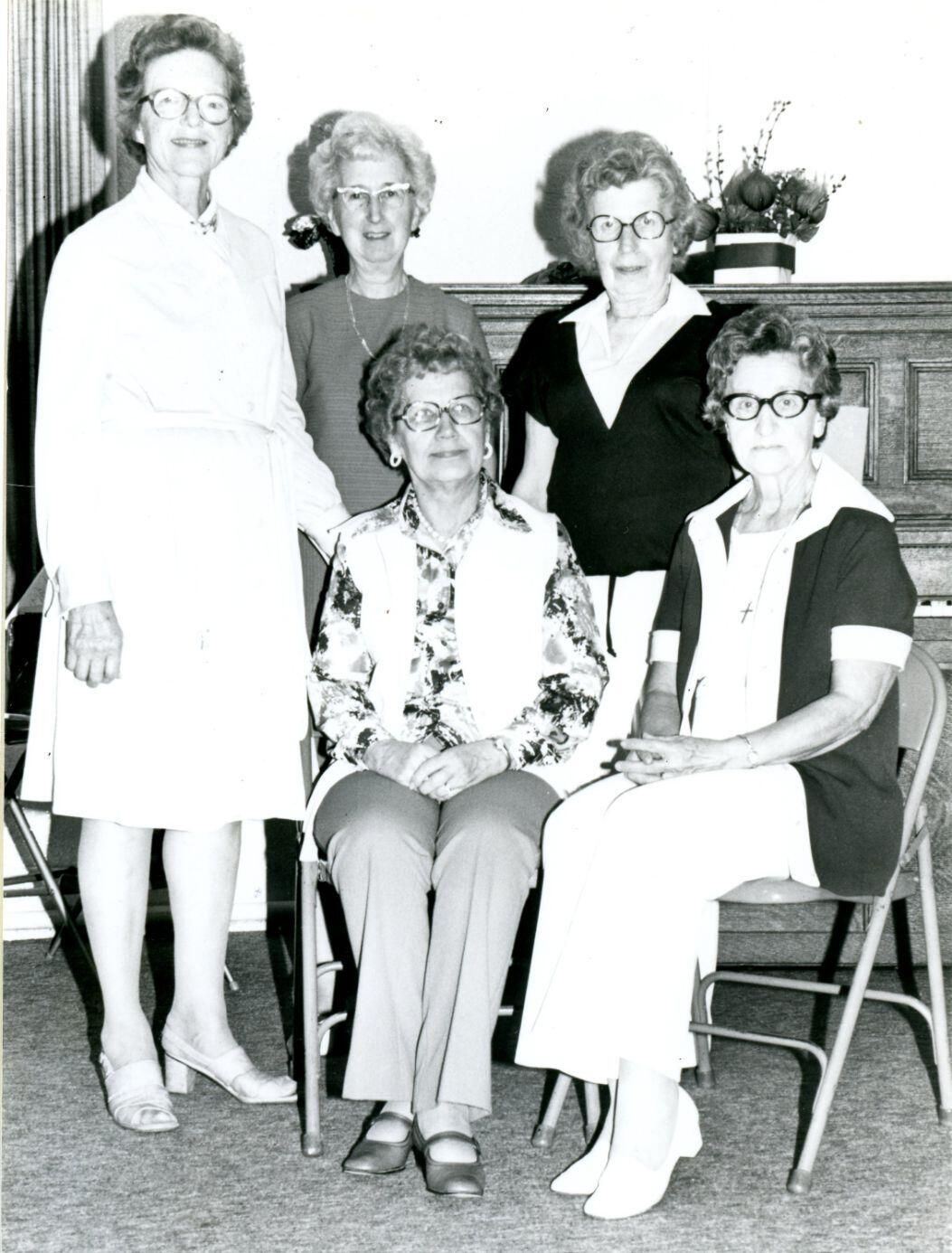 Michigan Association of Retired School Personnel officers in 1980. (seated) Rose Tarr, Dorthea Rosekrans, (back) Caroline Anderson, Marjorie Phillips, Elizabeth Devereaux, Vera Bryant (missing)/ Copy of photo used in Clinton County History (1980) page 624.
