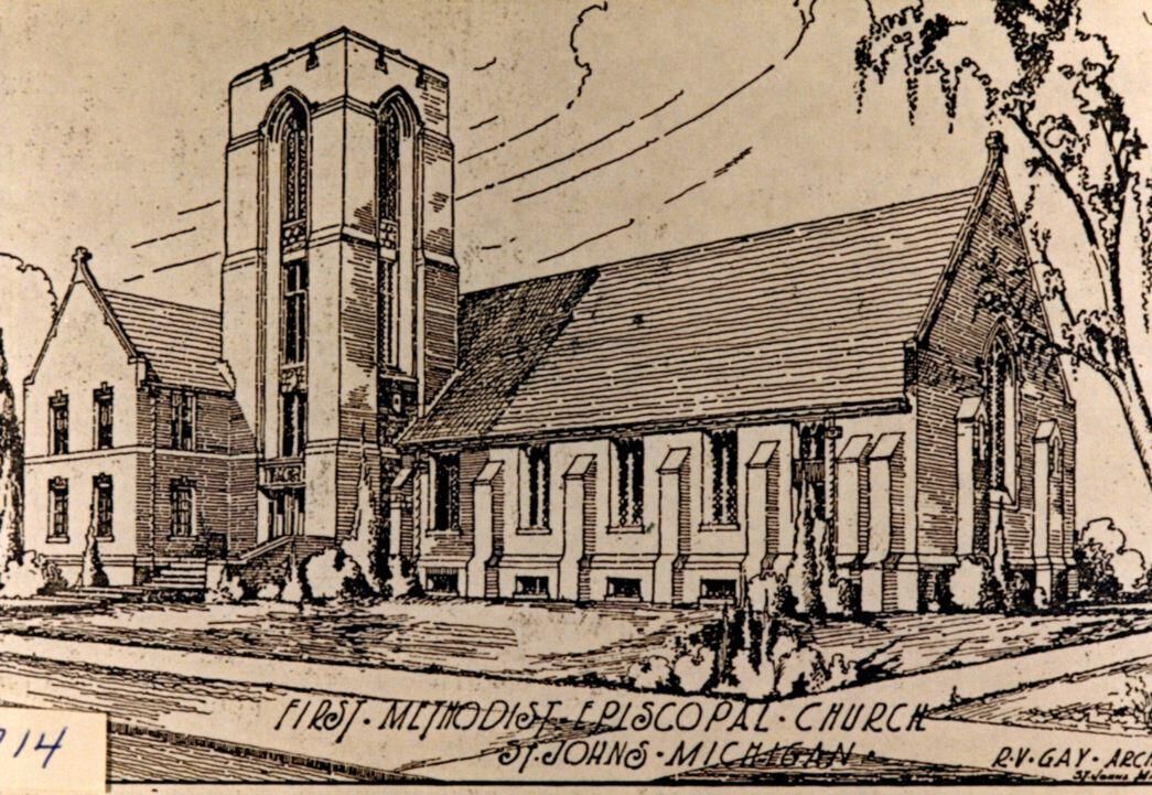 Copy of postcard of the Frist Methodist Church, St. Johns, (now Redeemer Campus - St. Johns) 3rd building designed by R. V. Gay.