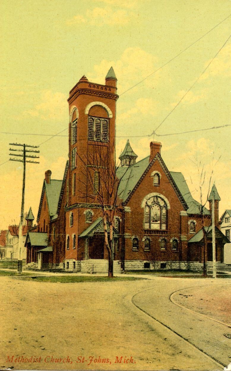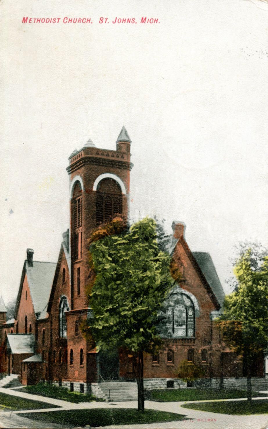 Postcards of the 2nd St. Johns First Methodist church building which burned. Post184 is a duplicate. Post150 is a reproduction of this postcard by Green Printing.