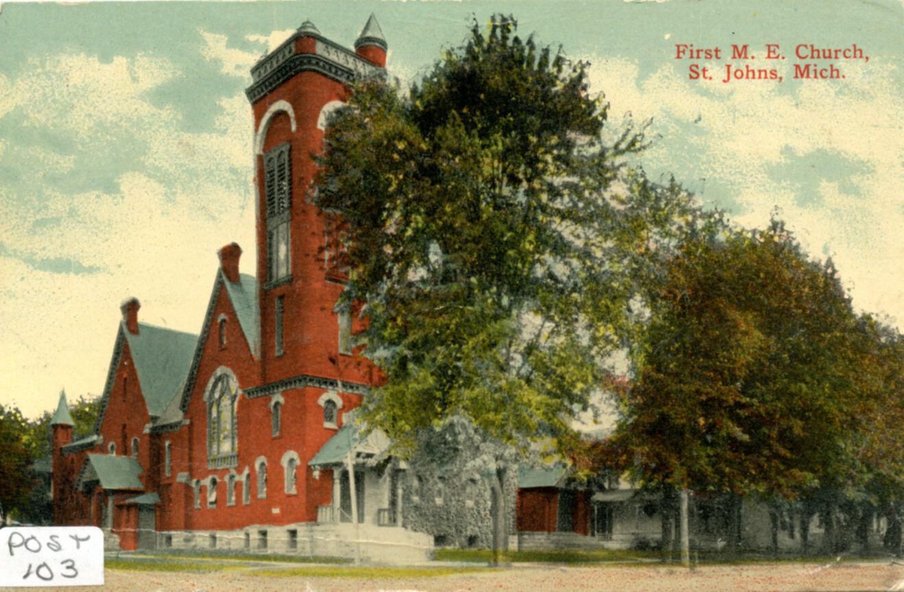 Postcard of First M. E. Church of St. Johns 2nd building.
