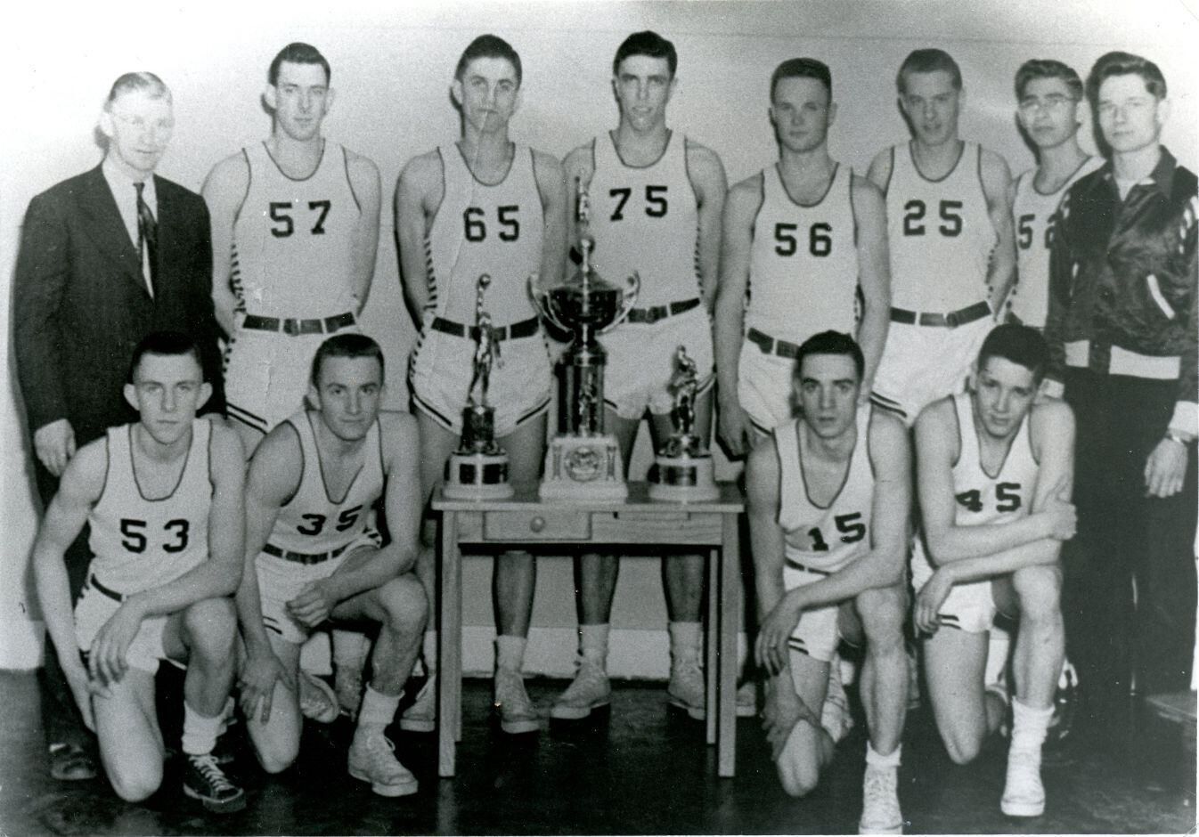 Fowler state championship basketball team from 1952; (back) Marion Piggott (coach), James Falk, Mark Thelen, Alan Thelen, Evart Sillman, Richard Schueller, Clement Hufnagel, Richard Schmitz, (front) Richard Thelen, George Fox, Richard Lucas, Frank Fedewa