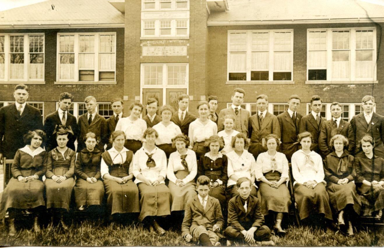 Postcard of Fowler High School, c1918. Pictured include Helen MacGregor, Reva (Wakefield) Ward, and Bernice L. Brown.