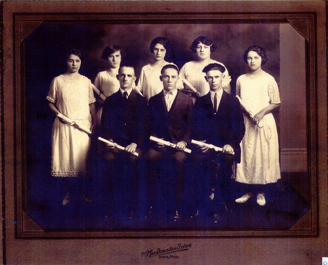 Fowler High School class of 1924. (back) Irma Hiner Snelling, Edna Martin Brown, Molly Fischer Falk, Thelma Naomi Smith Martin, Seraphine Noeker Halfman, (front) Otto Wakefield, Frank Rochon, Theodore Armbrustmacher. photocopy.