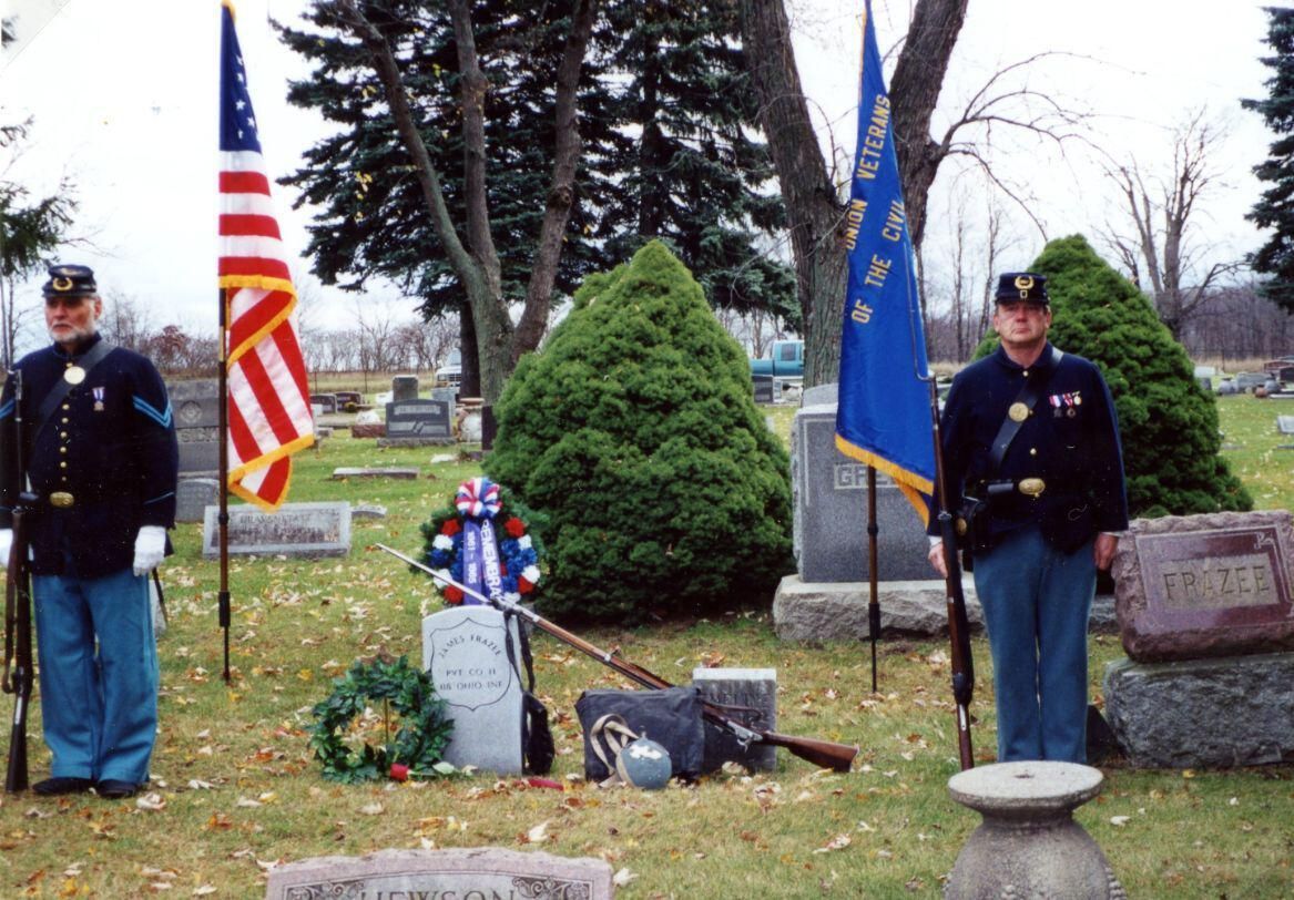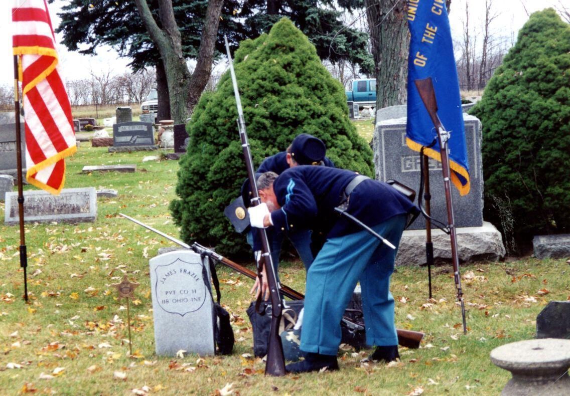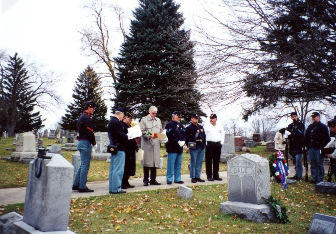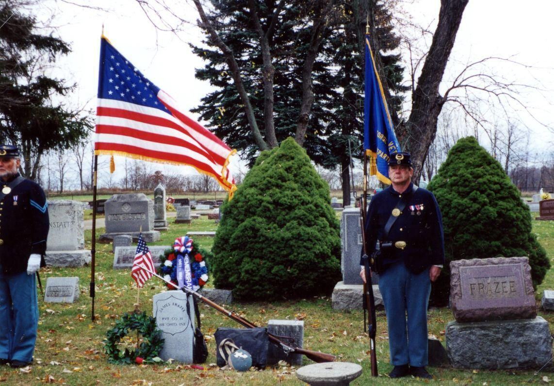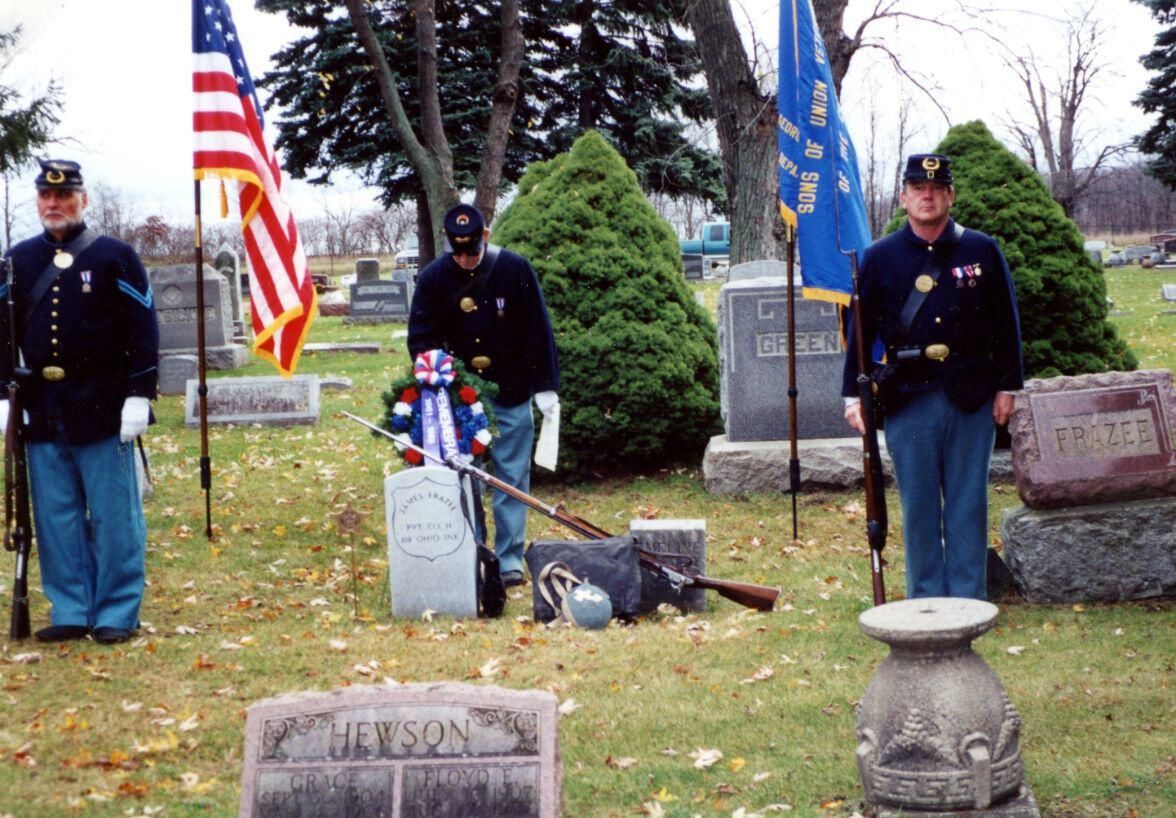 Sons of Union Veterans of the Civil War at James Frazee grave, North Eagle Cemetery, November 2000.