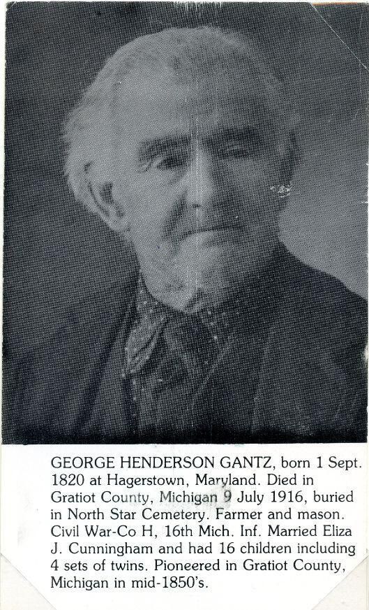 George Henderson Gantz. Civil War soldier in Company H of the 16th Michigan Infantry. Husband of Eliza J. Cunningham. Father of 16 children including 4 sets of twins.