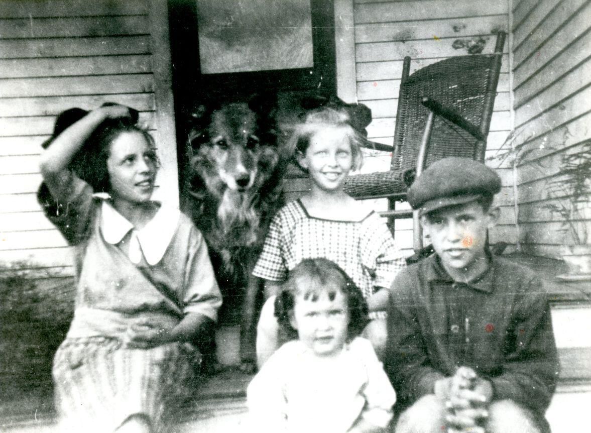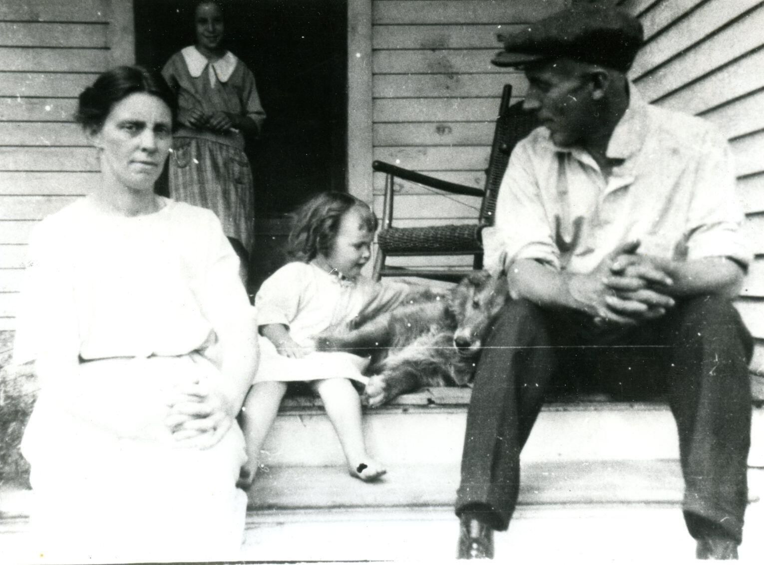 4- Children of Guy and Velma (Smith) Georgia: Irene, Daisy, Myron, and Marie taken on front porch in Chesaning, Michigan, with dog "Coolie". 5-Velma (Smith), Irene, Marie, and Guy Georgia with dog "Cooley" [Coolie/Cooley is spelled both ways in notes]