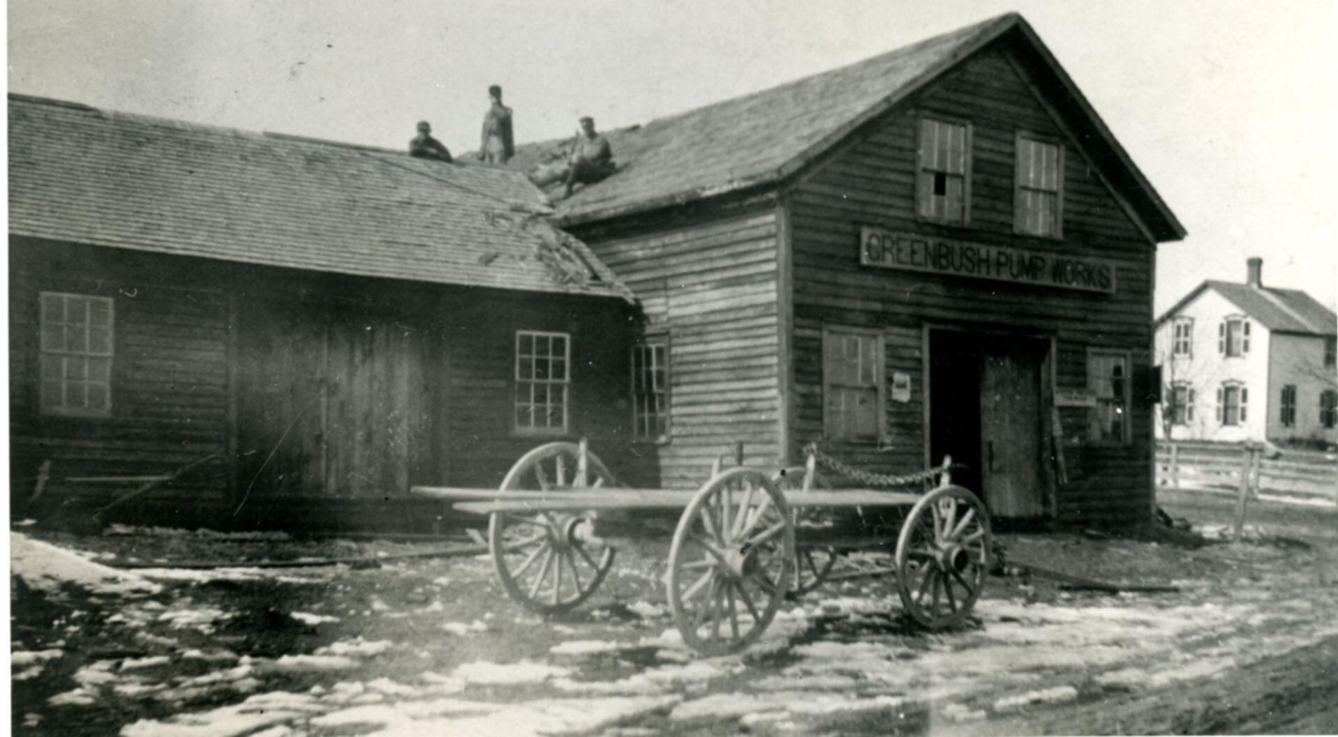 Greenbush Pump Works, 1910, was on the corner of Maple Rapids and US-127. Owned by Hiram and his son Leonard Post. They made several hundred pumps a year.