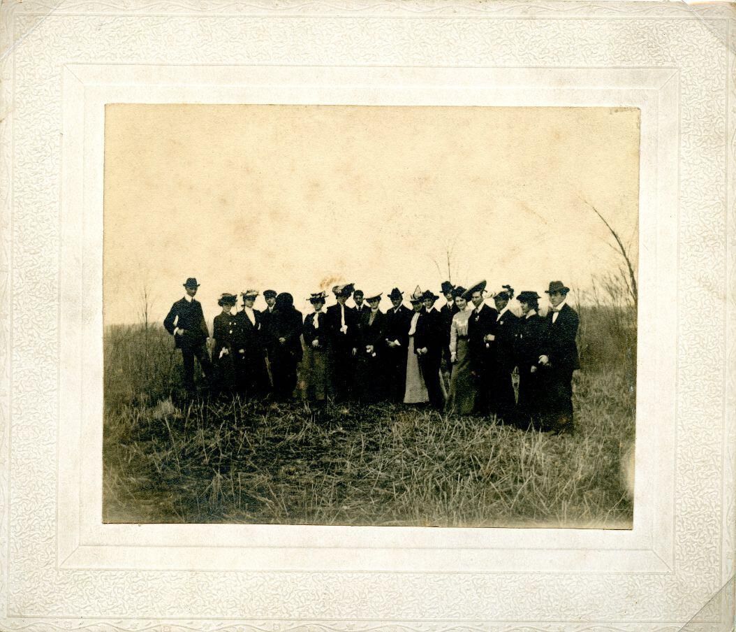 Miss Holiday, Miss Quant, Mr. Belmore, Mr. Reed, Miss Hart, Mr. Weisel, Mr. Mussel, Miss McCall, Mr. Page, Miss Read, Mr. Miller, Miss Nuffer, Miss Love, Mr. Rineger, Mr. Nadean, Miss Belt, Miss McDonald, Mr. O'Brien. Taken April 19, 1903 by Mr. Whaley.