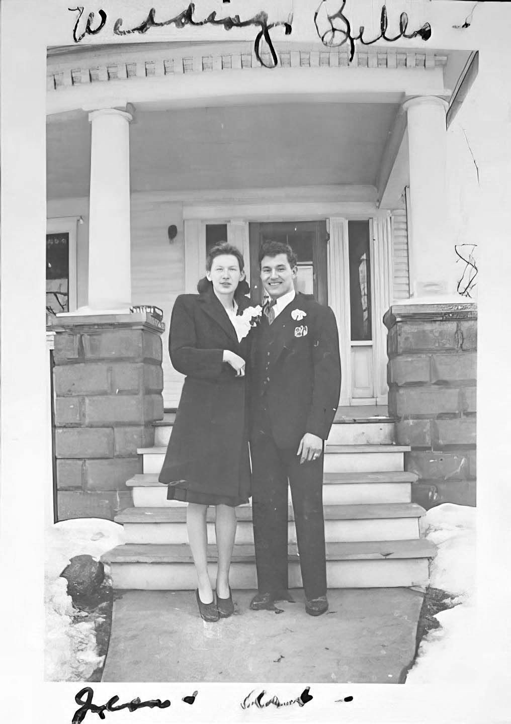 Jean Halterman and Art Newman Wedding. Taken in front of the Halterman house on S. Bridge Street.