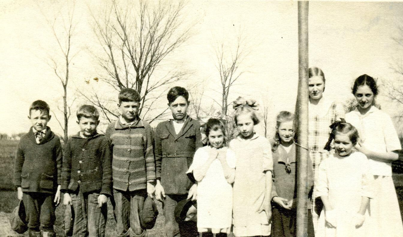 Hammond School of Essex Township c1920. Reva (Wakefield) Ward (teacher), Pictured are: Dale Anderson, Oscar Husted, Claude Husted, Ellis Hughes, Bernice Brock, Helen (Ferguson) Murton, Louise Wilbur, Esma Ferguson, Aileen Robertson, and Jean (Anderson) Openlander. The began with 10 students and ended with 7 as 3 moved away.