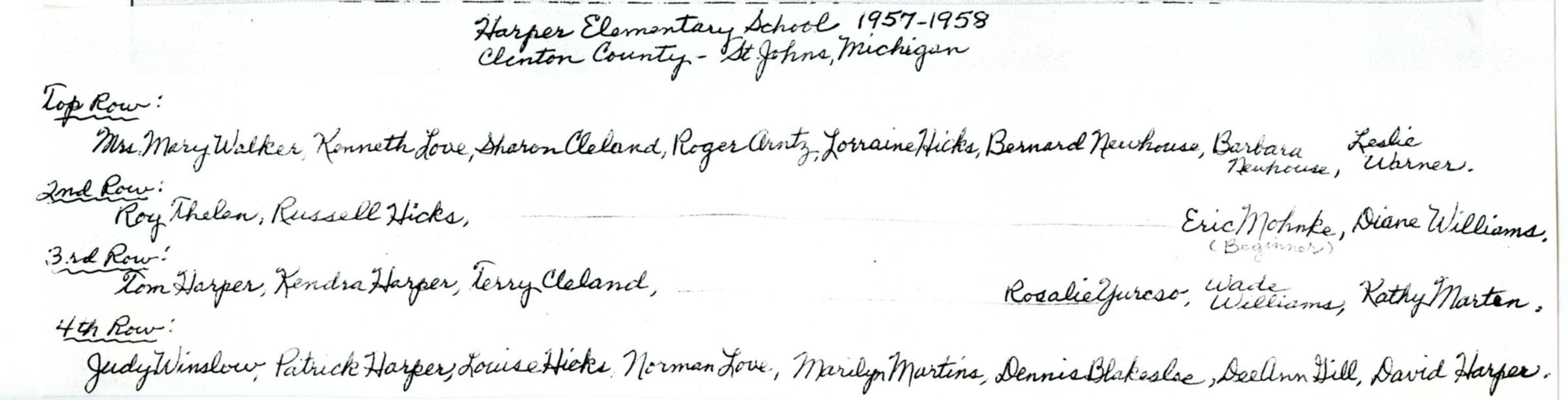 Harper School, 1957-8. Mary Walker (teacher). photocopy.