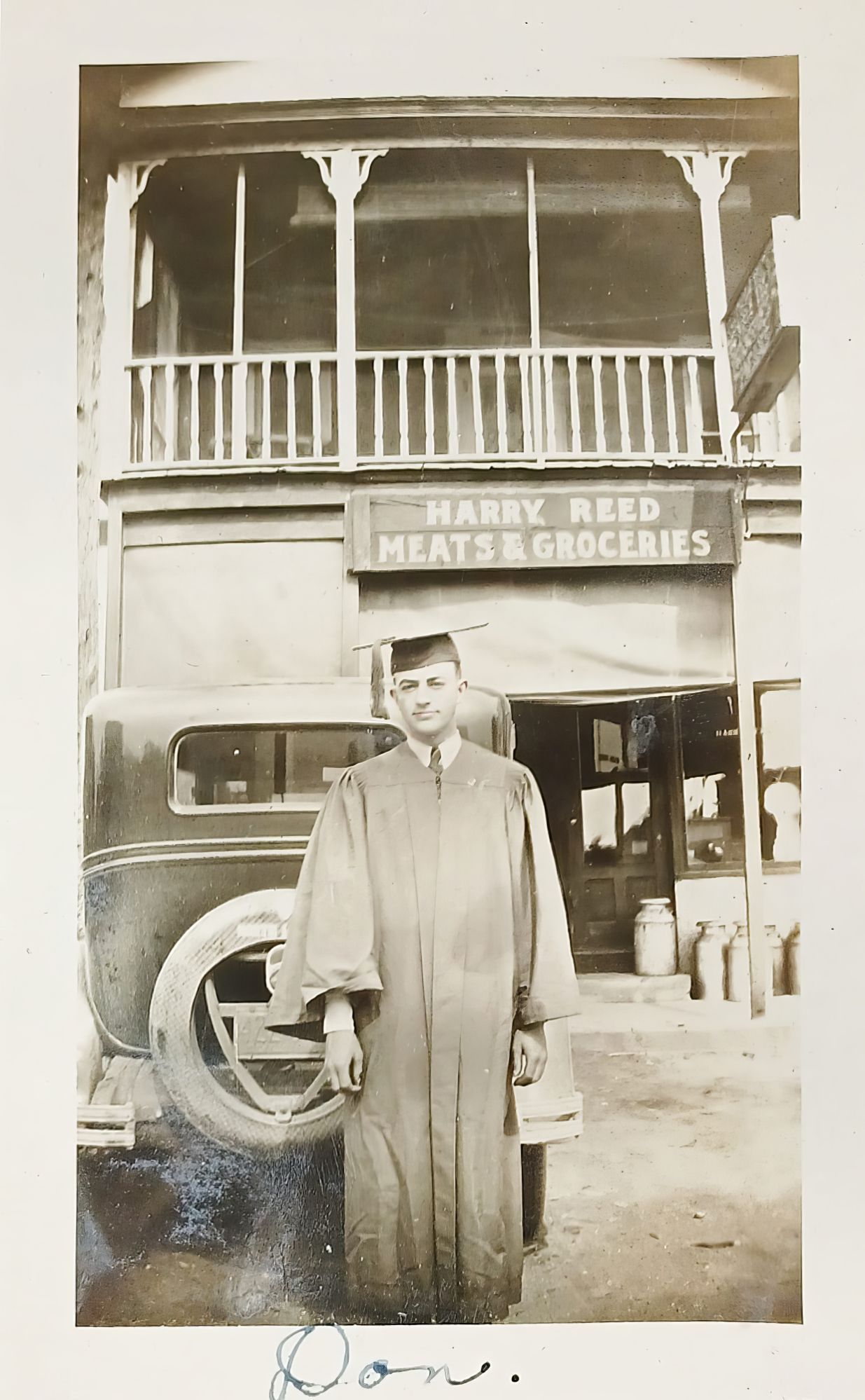 Don Reed in graduation robe standing in front of the Harry Reed Grocery Store on East Bridge Street, DeWitt.