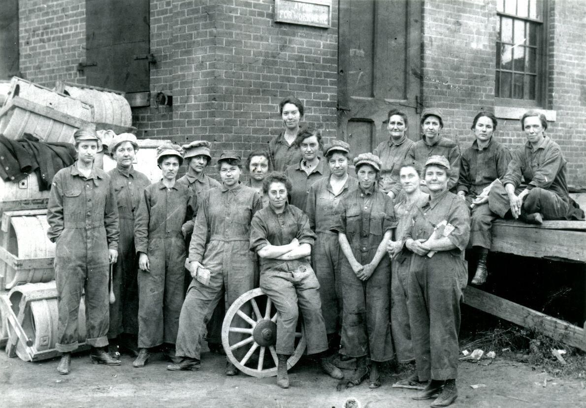 Hayes Wooden Spokes Wheel Factory, St. Johns. Pictured: Theda Wheeler Hall, Mrs. Welton, Lelia Peck, Mrs. Little, Billie -?-, FLorssie Haynes, Dora Russell, Beulah Hulbert, Baker, Etha Lyons, Helen Hunt Salter, Florence Russell, Mae Crowner, Klug?, May Bradley, Ivah Allen, Ann Fish. Copy of photo used in Clinton County History (1980) page 156. Additional copy PI212-212.