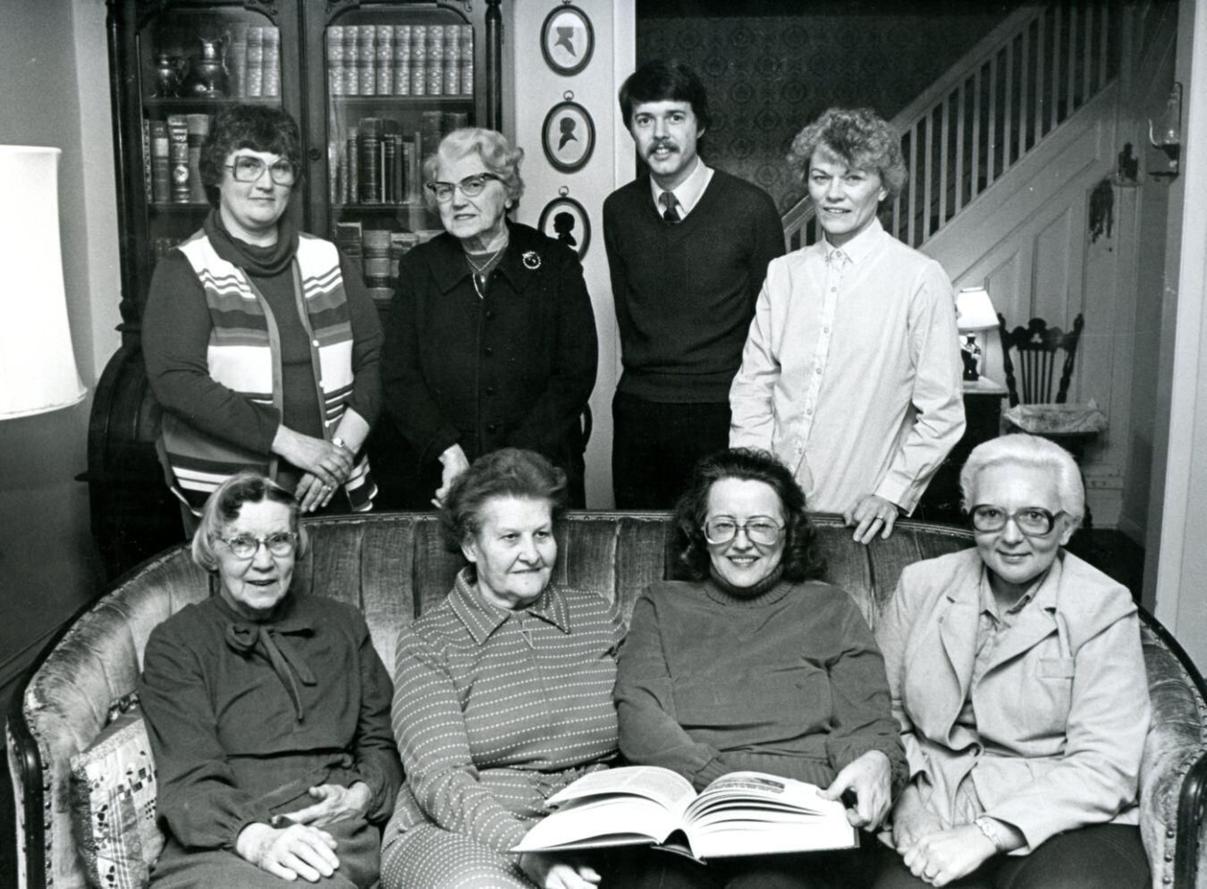 Book committee for the 1980 History of Clinton County. (back) Betty Moore, Hila M. Bross, Ken Coin, Betty Jane Minsky, (front) Alice Jumper, Bertha Light, Shirley Karber, Jean Martin. (missing) Joan Bancroft, Helen Crum.