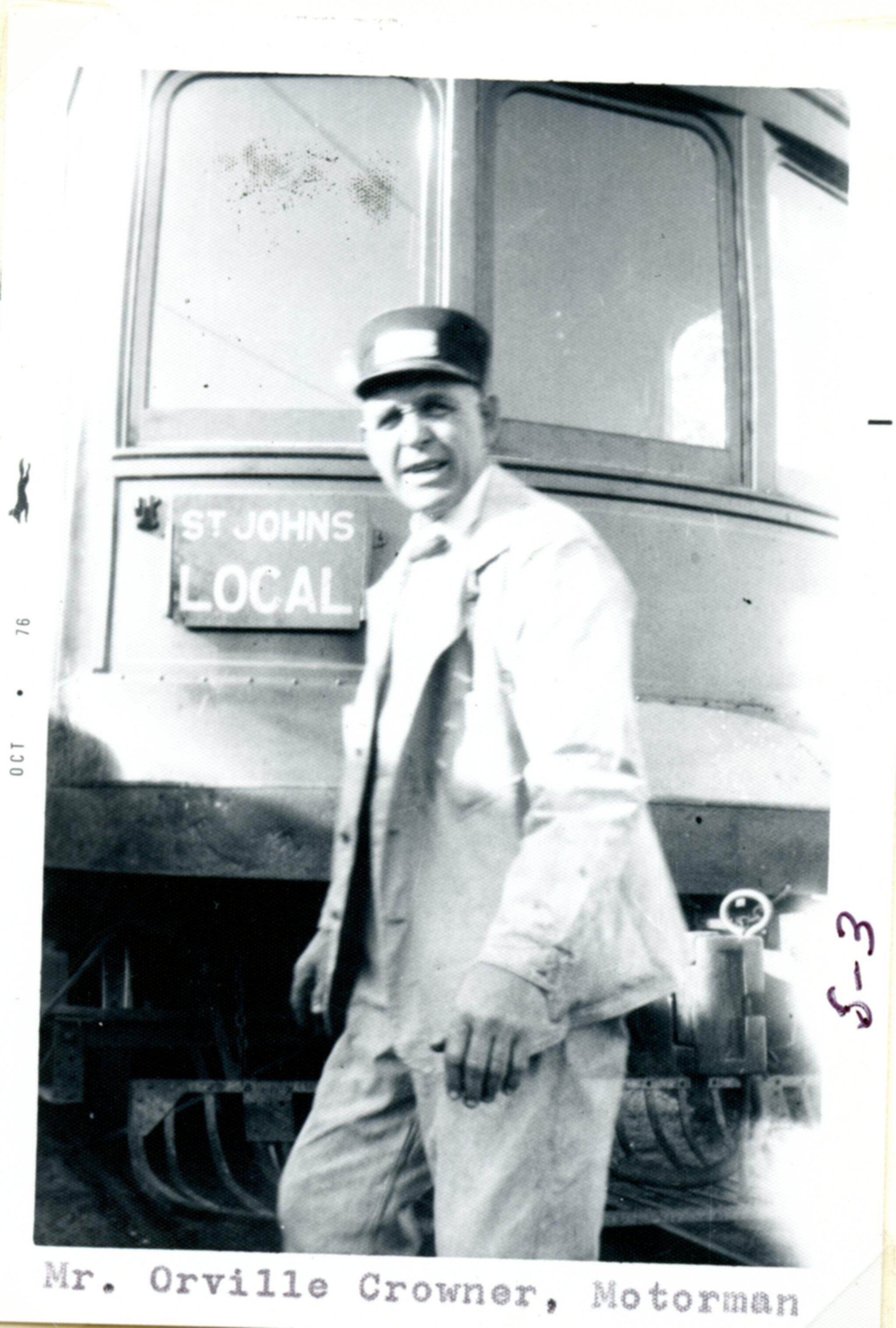 Orville Crowner, motorman in front of the St. Johns local from 1917. copy