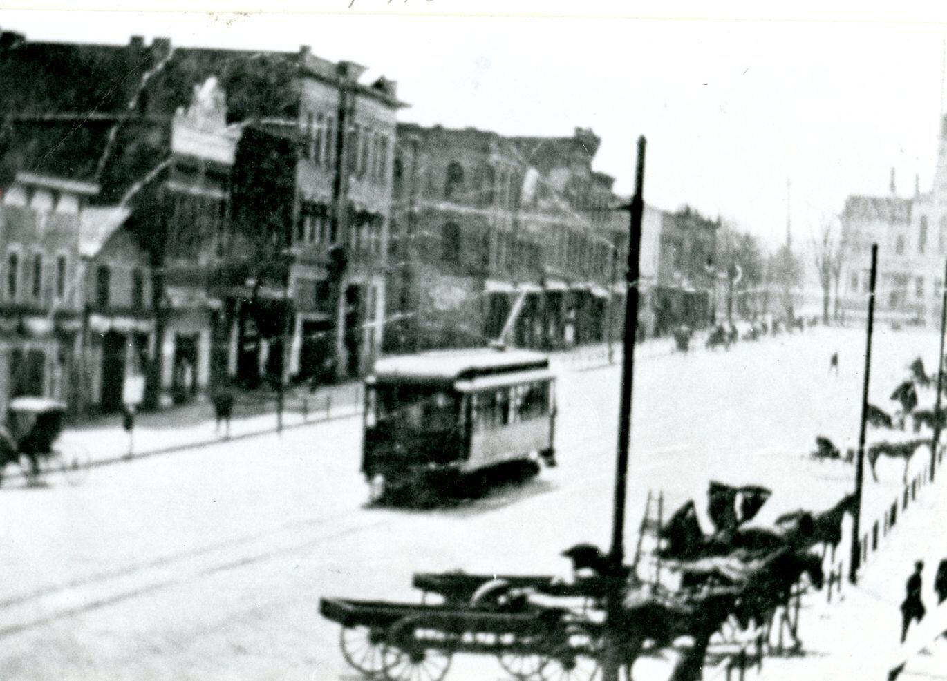 Interurban traveling north on Clinton Avenue, St. Johns. c1910. Copy of photo used in Clinton County History (1980) page 677.