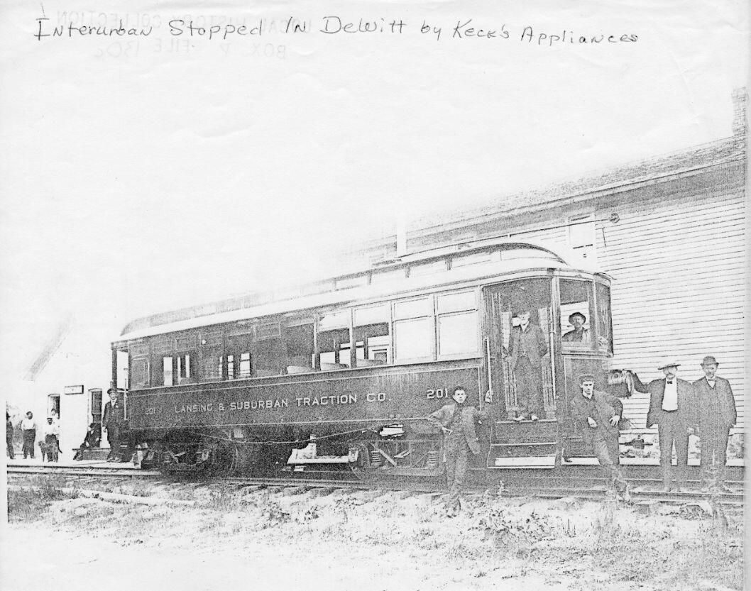 Interurban at DeWitt Depot (photocopy of originals owned by Gwen House). Stopping next to Woodman Hall.
