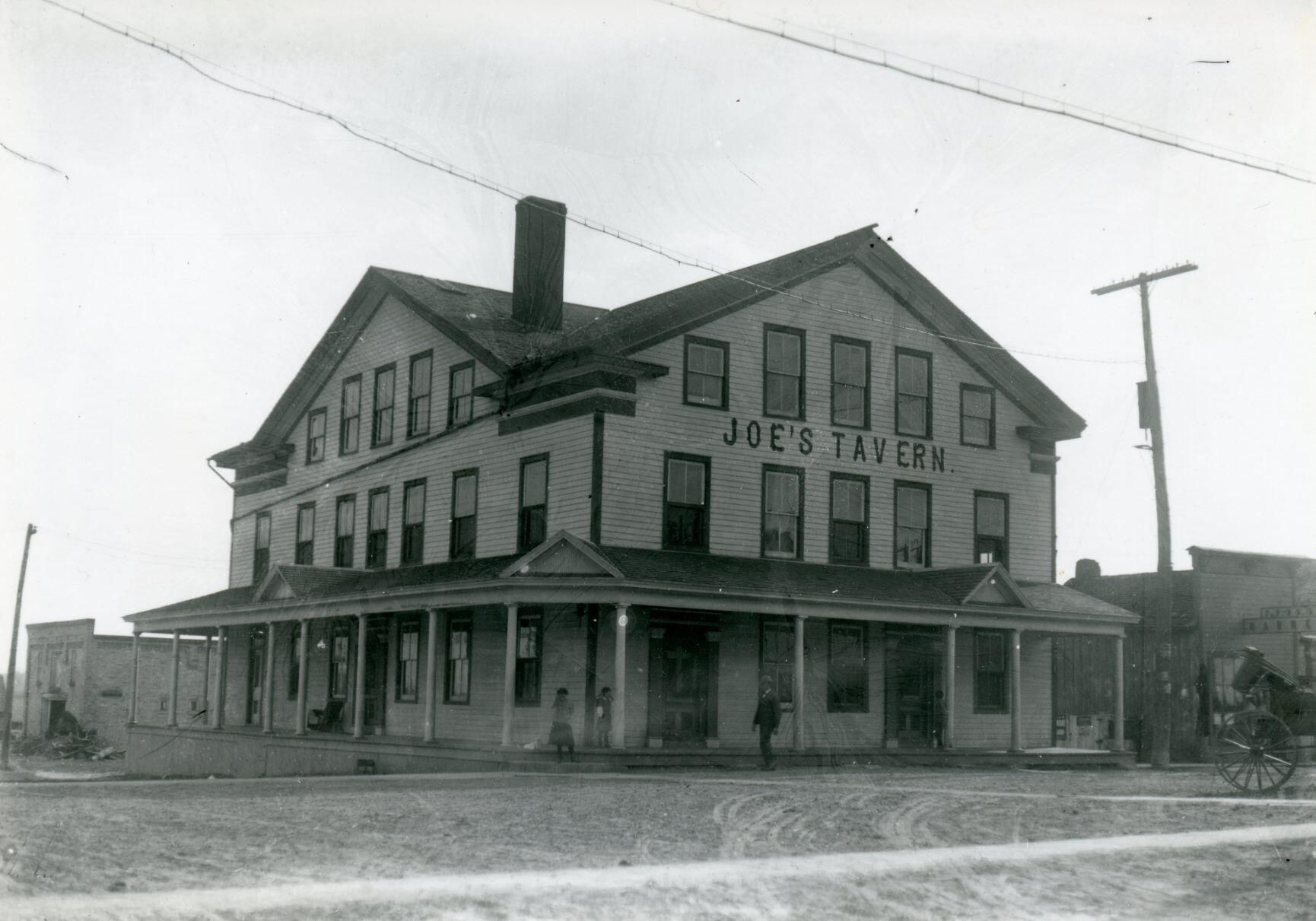Joe’s Tavern (Clinton House) with hotel livery on left and Frank Rose’s Harness shop on rightCollection