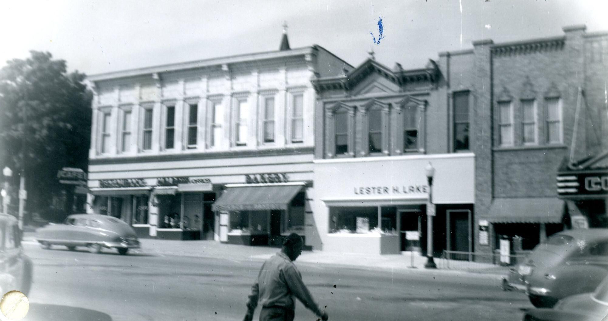John Harvey Building and Lester Lake, St. Johns, Michigan. Taken September 1950.