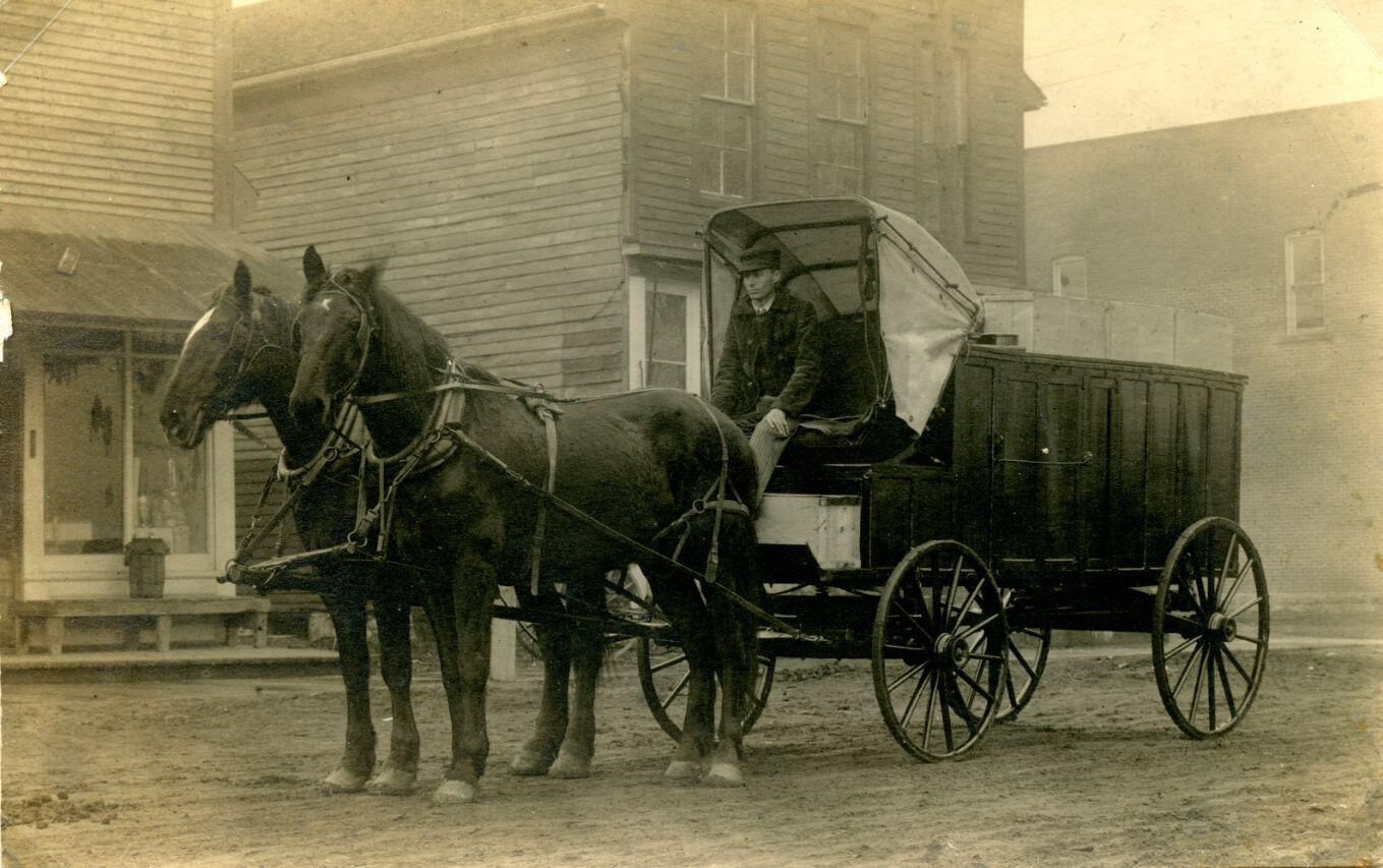 Charlie Johnson with horses and wagon for egg business ad.