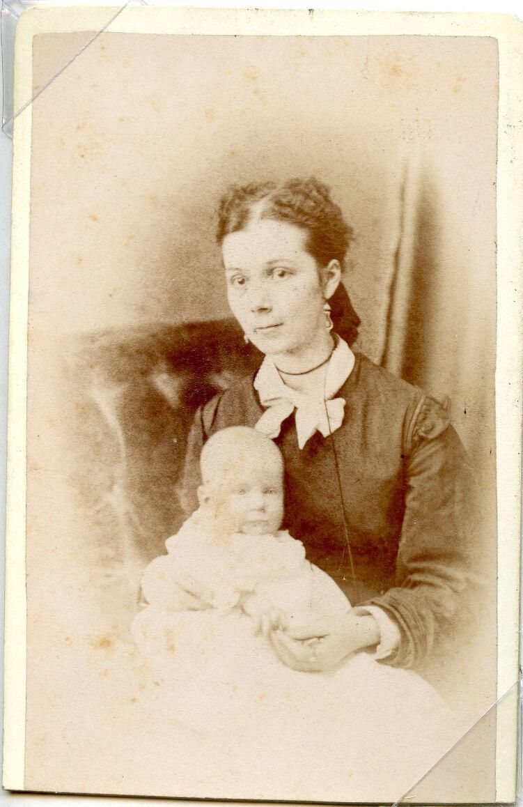 Amelia F. (Frink) Kneeland, daughter of Miner R. Frink and wife of Horace Barnes "Barney" Kneeland. Also pictured is infant son Dow. Photo taken in 1878.