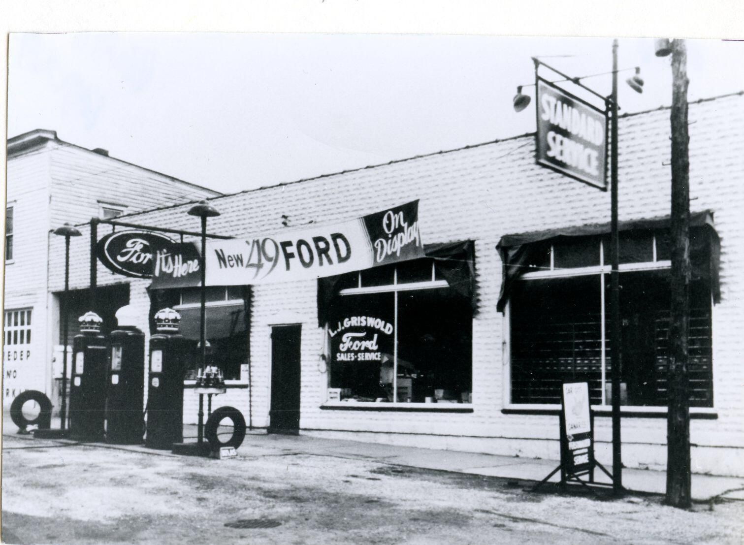 L. J. Griswold Ford dealership in DeWitt in late 1940's. Copy of photo used in Clinton County History (1980) page 693.