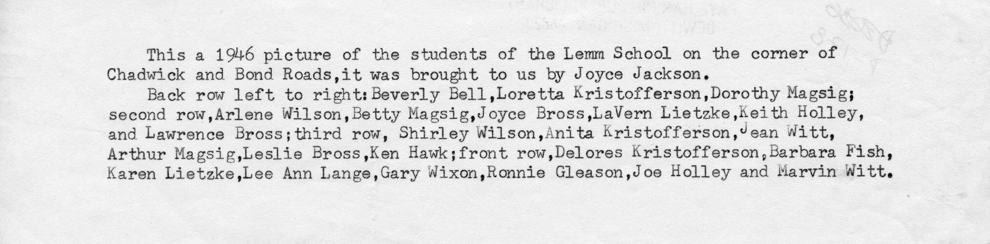 Lemm School at Chadwick and Bond roads (see P178B for names)