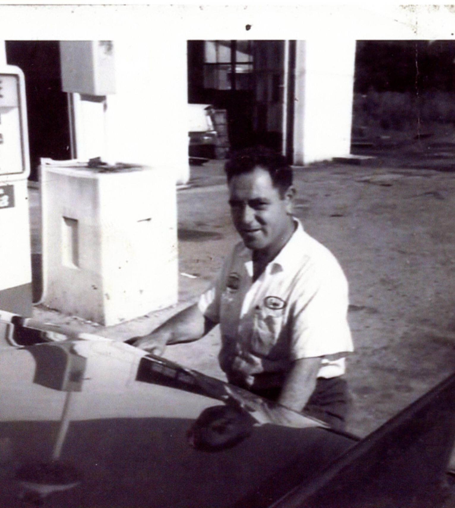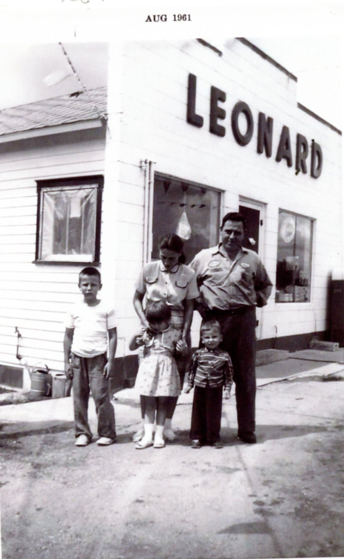 Leonard gas station at 11530 Old US-27, DeWitt, Michigan. S-128 shows (back) Tony, Elsie and Gene Vettraino (front) Rebecca and Vince Vittraino. S-129 is Gene Vettraino pumping gas.