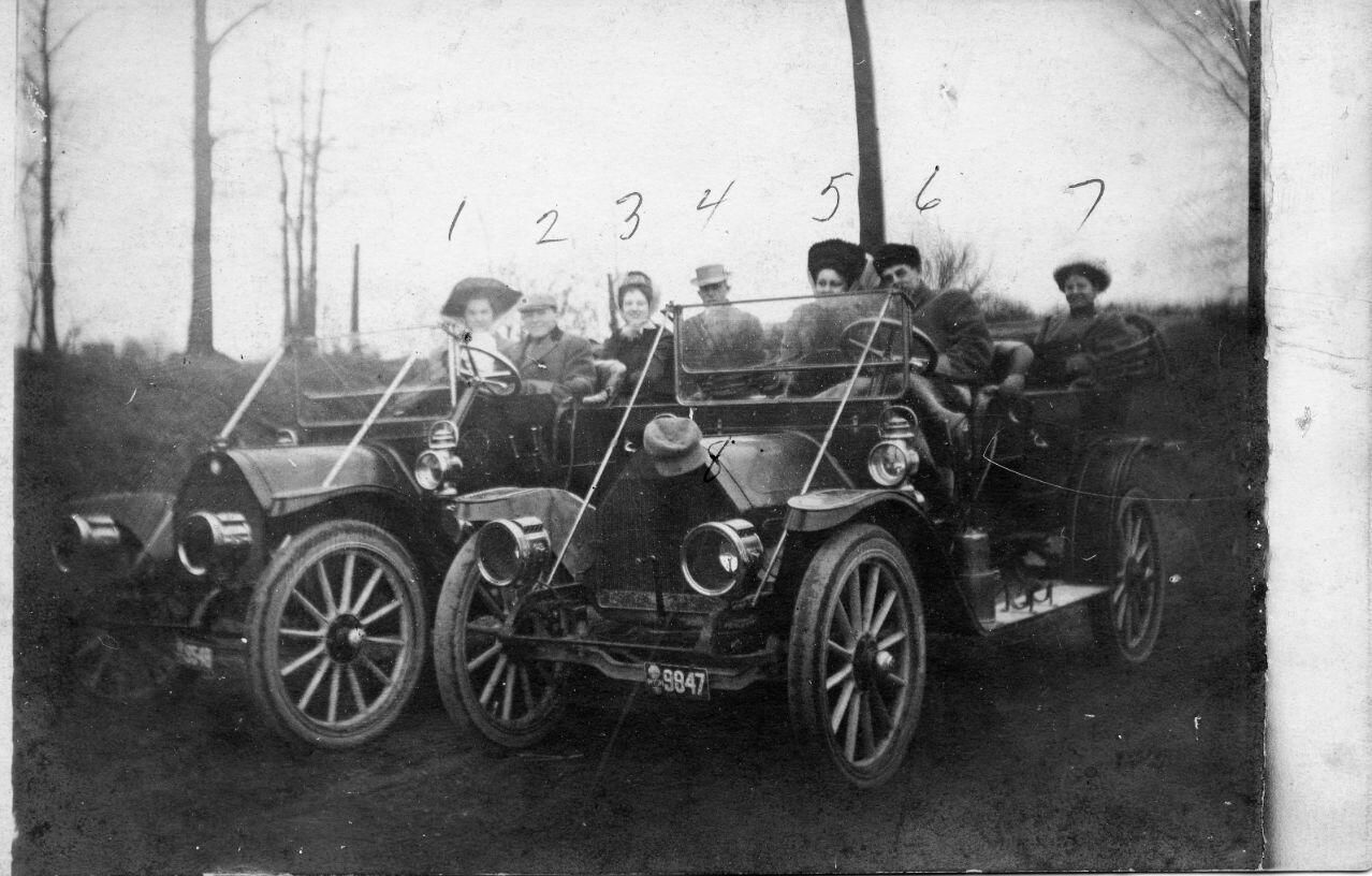 Dyle Linn (his cap in photo) took this photo of friends in cars with (l to r) Reva Treadwell, Lawrence Woodruff, Hazel Bray, Fred Vail, Lorna Woodruff, Bessie Webb.Collection