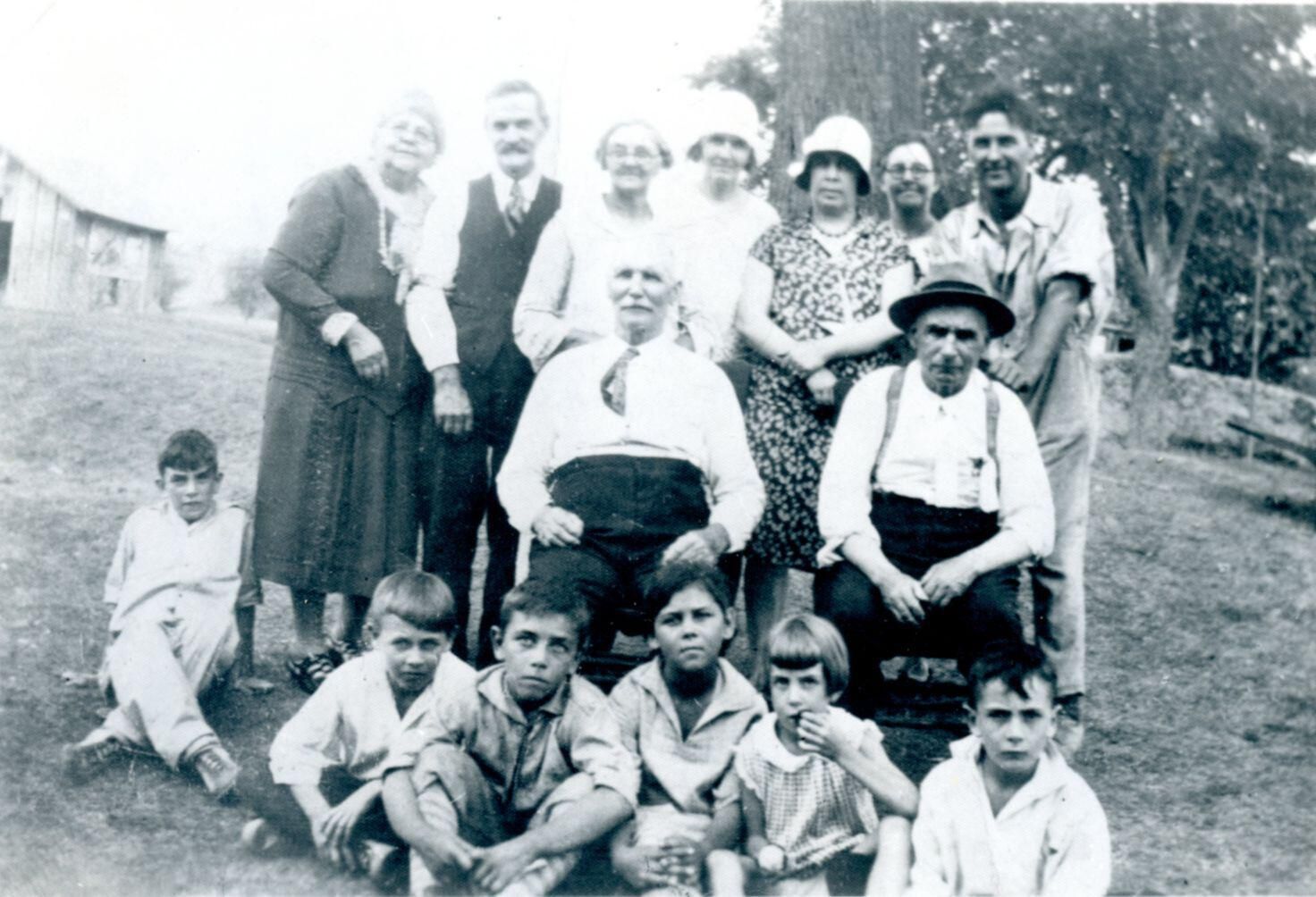 Thomas Joseph Lowe family c1929-30. (back) Frances "Frankie" Griffin VanOstran Bain, Mabel VanOstran Lowe, Laura Ahern Lowe, Mary Pearce, Florence Lowe Dennis, Vernon Lowe. (Sitting) Tom and Terry Lowe. Children include: 2 Langdon children, Robert Lowe, Shelby and Ferne Dennis, Lawrence Lowe. From 1980 History of Clinton County page 173.