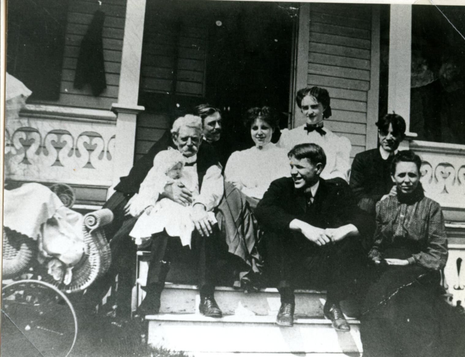 MacPherson family in 1905. (back) Donald Hugh, MD; MIss Edwin, MD; Winnifred Alger MacPherson; George L.; (front) Dr. George MacPherson holding Ann, William Wager MacPherson, Etta. From 1980 History of Clinton County page 186.