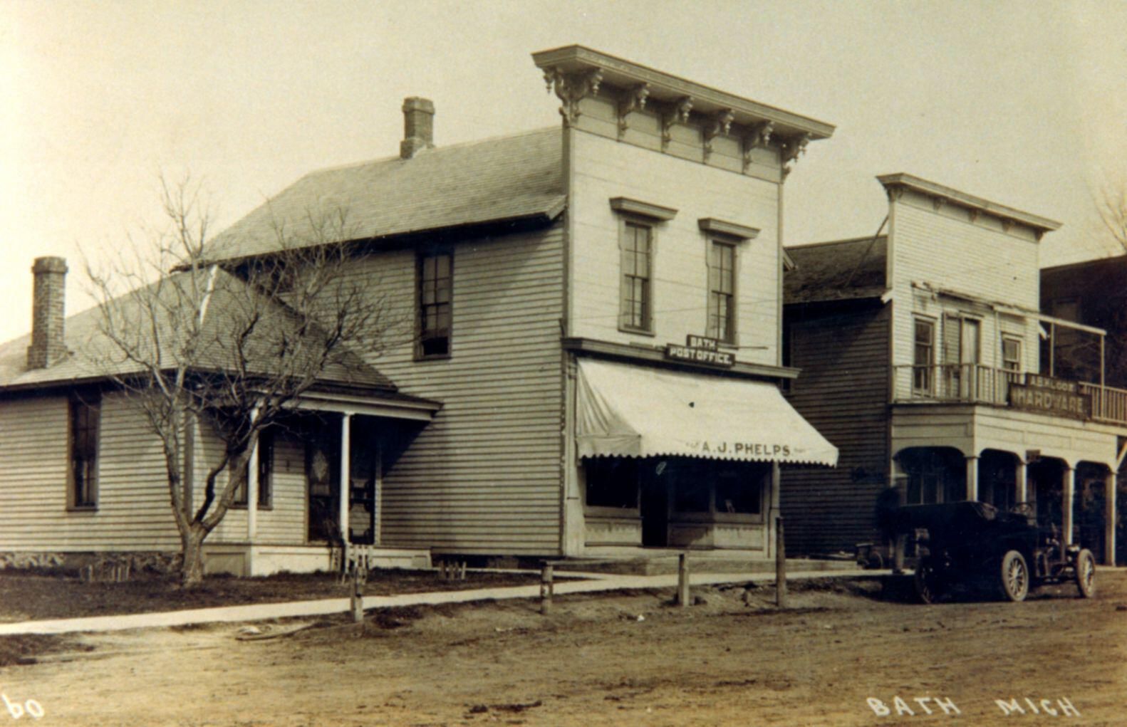 A copy of a postcard of Bath, Michigan with post office.