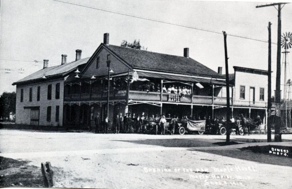 Postcard reproductions by Green Printing. Post114 - Maple Hotel, Post115 (also duplicate Post135) - Maple Rapids business street scene. (fair use thumbnails)