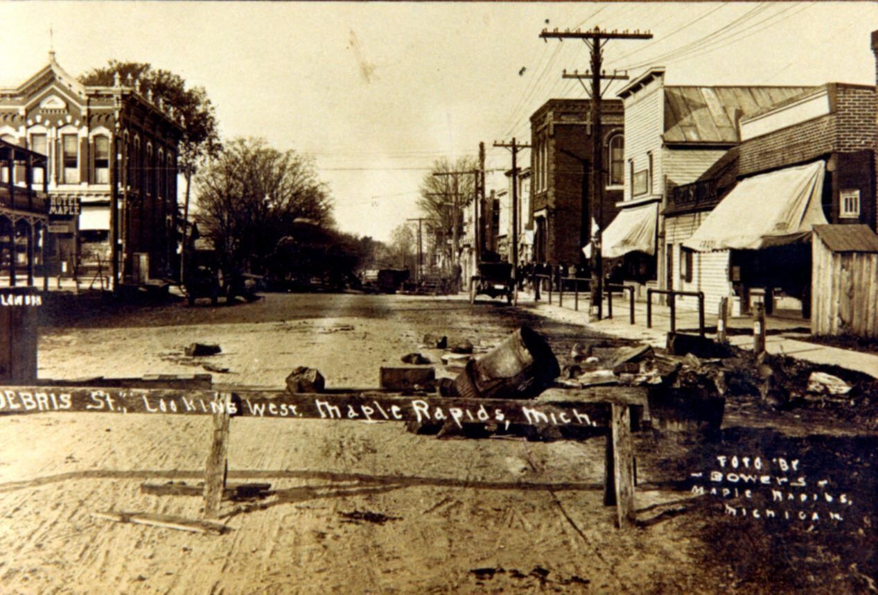Copy of a postcard of "Debris St." looking west c1910 after Halloween, Maple Rapids.