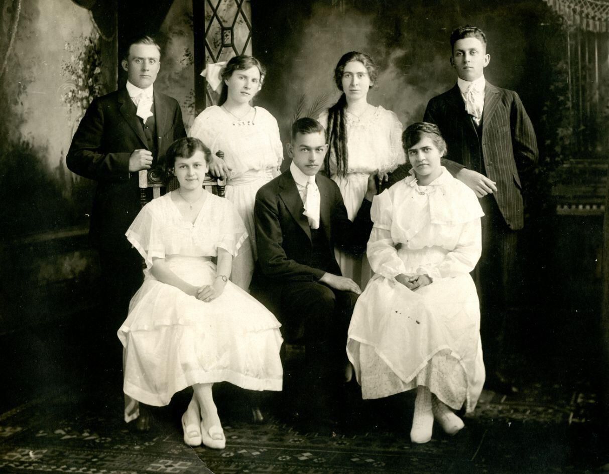 Maple Rapids High School graduating class of 1917. Dee Allen, Norma Bullis, Thelma Benson, Paul Paine, Anabelle Millard, Oramel Riker, and Mildred Cowles.