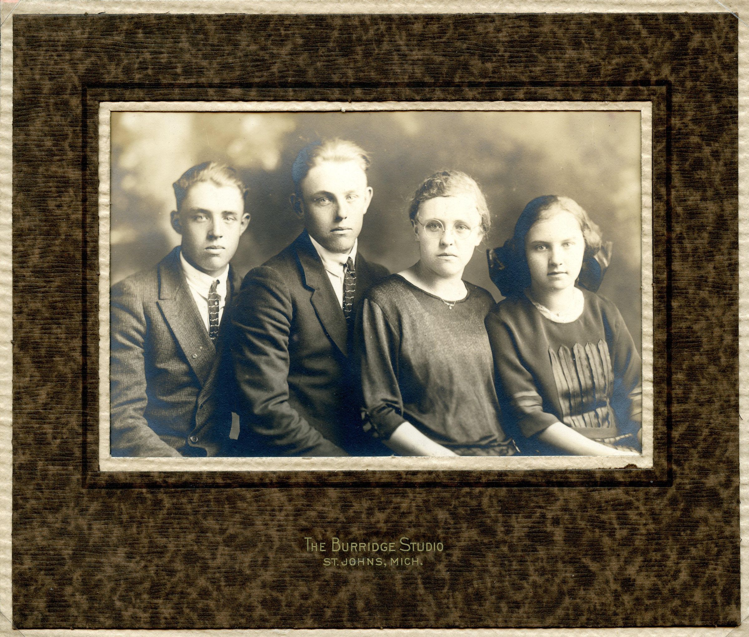 (left to right) Carl Marten, ernest marten, Lula Marten (married Earl Jastram), and Florence Marten (married John Jastram). Children of Theodore and Mary Marten of Riley Twp.