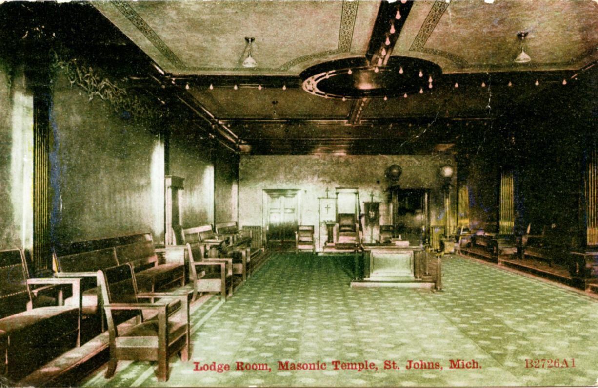 Postcard of the Masonic Temple lodge room in St. Johns.
