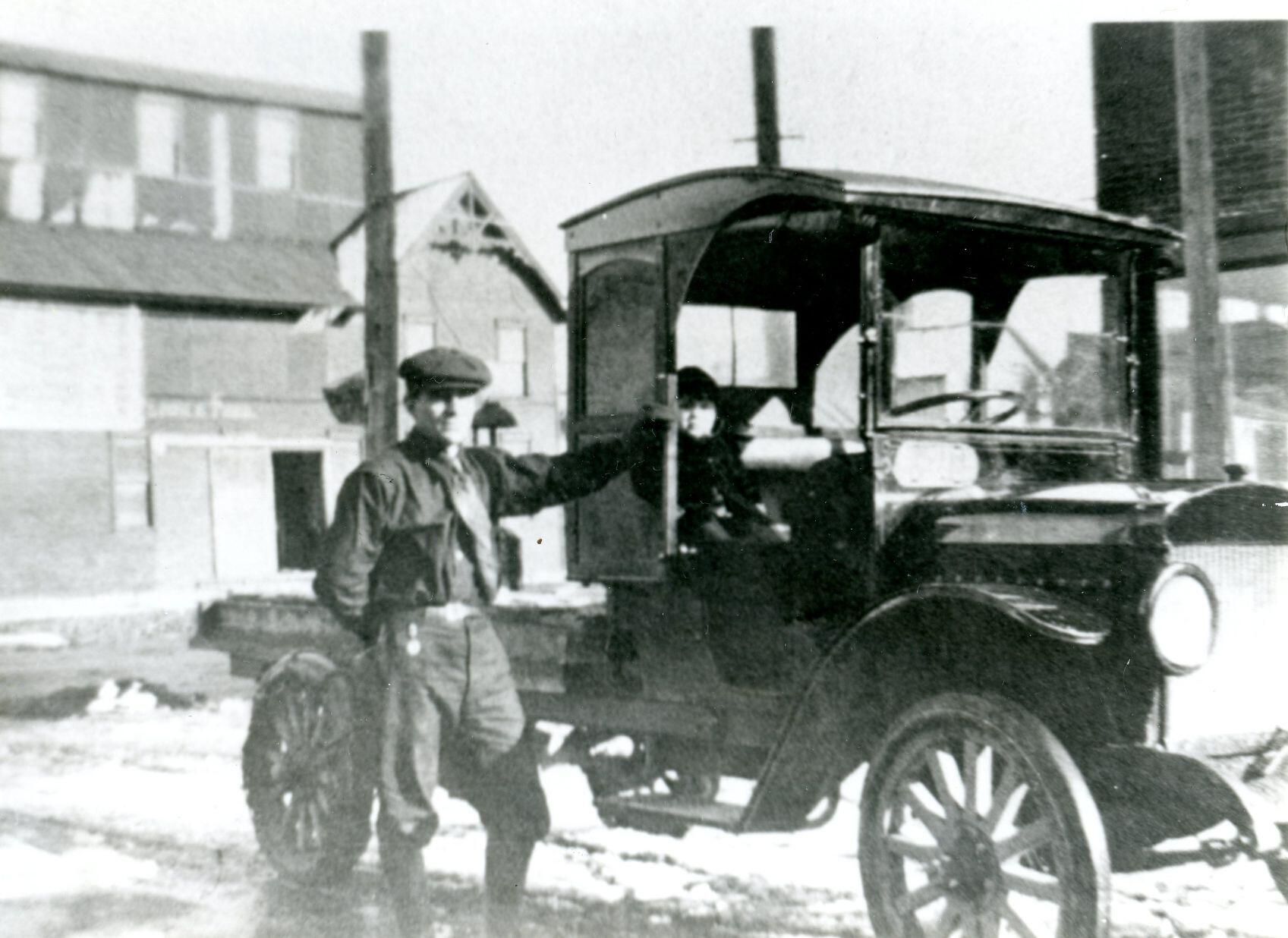 William Luecht stands next to the first Maxwell truck in St. Johns sold c1924 to Sid Smith. Copy of photo used in Clinton County History (1980) page 744.