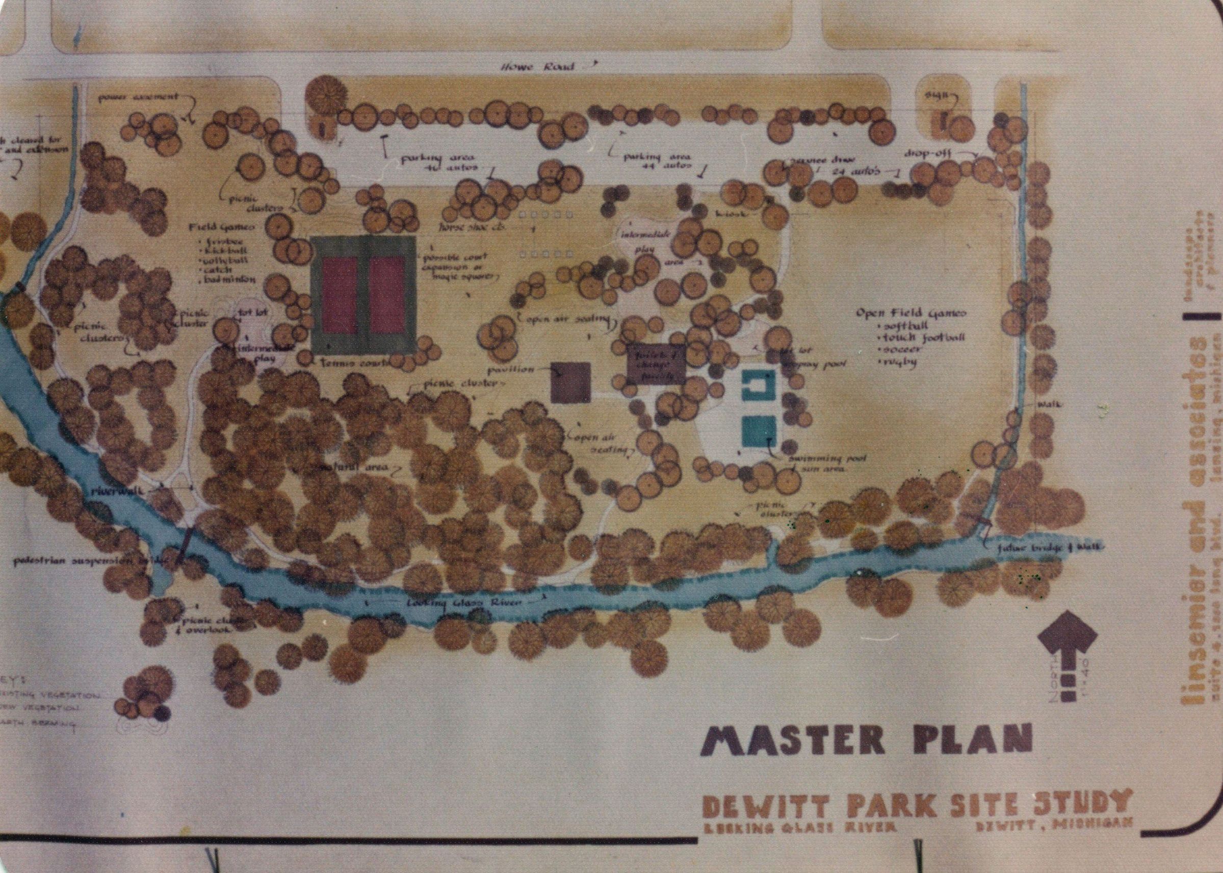 Original c1974 plan for McGuire Park at 911 W. Main Street, DeWitt. The original name was West Side Park. The DeWitt fire station was moved to the east half of this park.