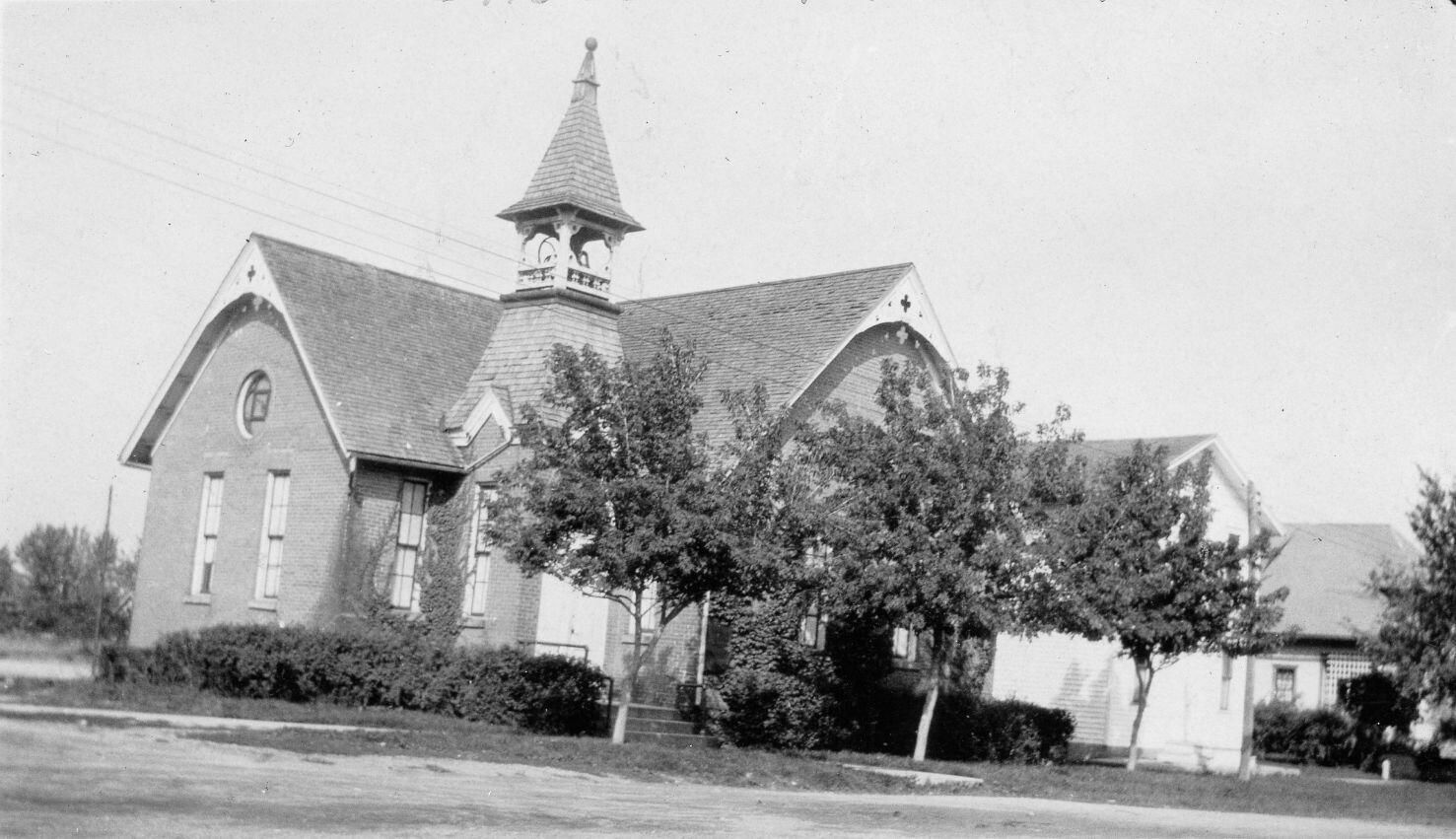 2nd Methodist Episcopal Church building on N. Bridge (burned March 10, 1928) - Grange Hall and Carl VanFleet home to the rightAcquisition