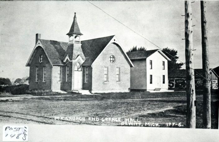 Postcard reproduction by Green Printing of DeWitt Methodist Church (2nd building) and grange hall. (fair use thumbnail)