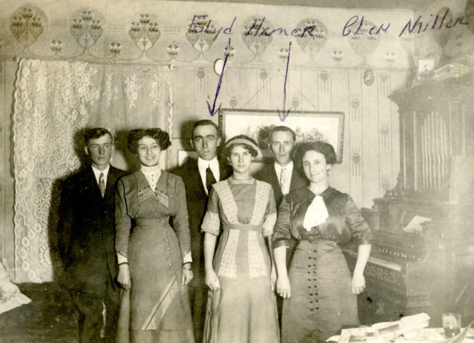 Floyd J. (son of Jacob and Elizabeth Miller) and Homer Miller (son of Gilbert and Inez Miller) are identified. Glenn Miller (son of Septimus and Rebecca Miller) could be the 3rd man. Women are possibly their wives.