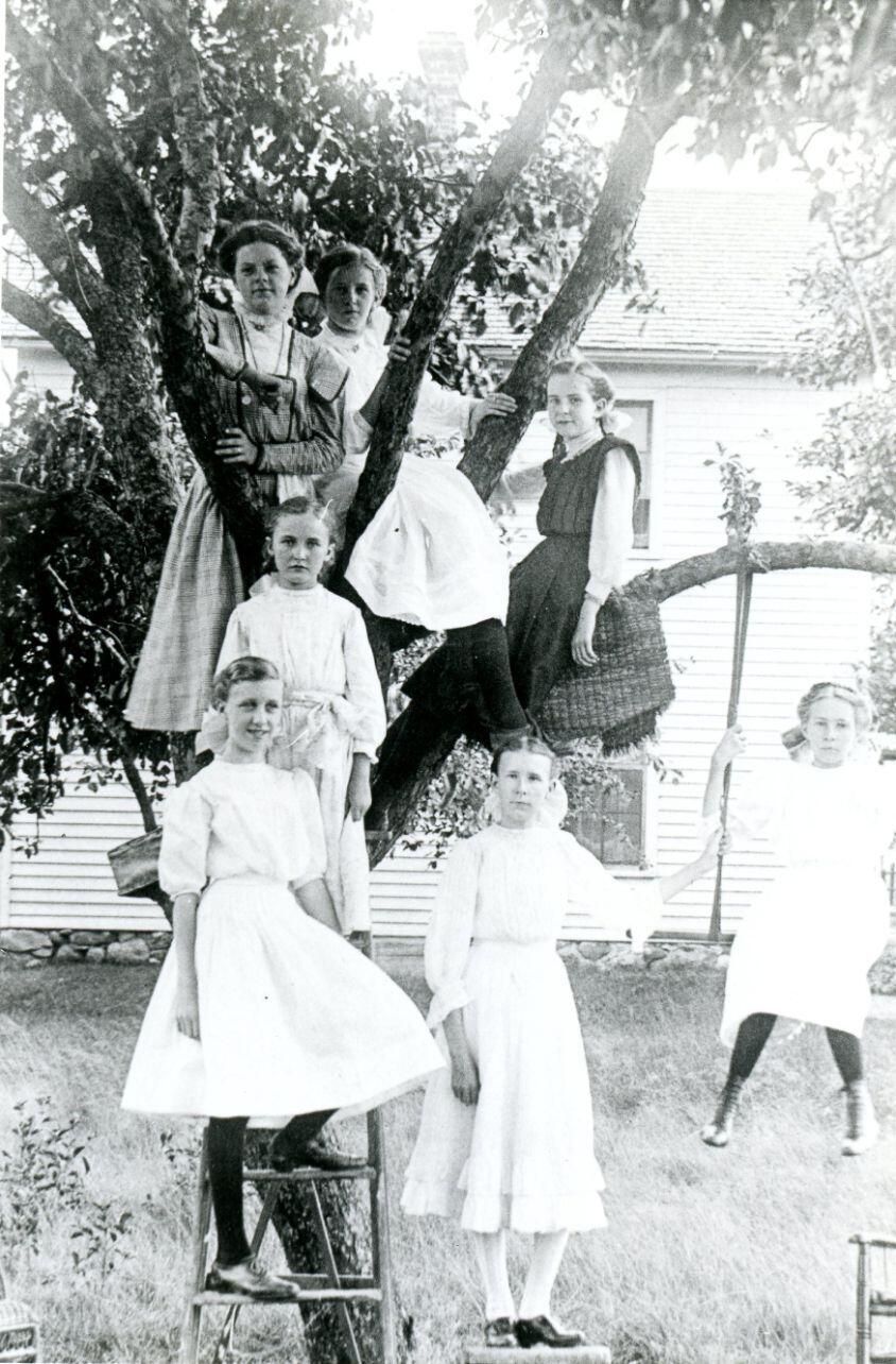 The Model Club of Maple Rapids. (in tree) Gladys Parr Barton, Margie Pease Blemaster, Mildred Owen Shelters, (on ladder) Blanch Randolph (top), Athol Gamble, (on chair) Bernice Payne Estes, (on swing) Beulah Payne Pecore. Copy of photo used in Clinton County History (1980) page 625. 2nd copy PI216-30.