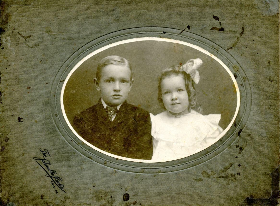 John Barnett Moorhead (age 11) and Agnes Mary Moorhead (age 4). Photo taken c1907 by Schnauble of Erie Pennsylvania. Children of Victor and Anna (Slemmons) Moorhead.