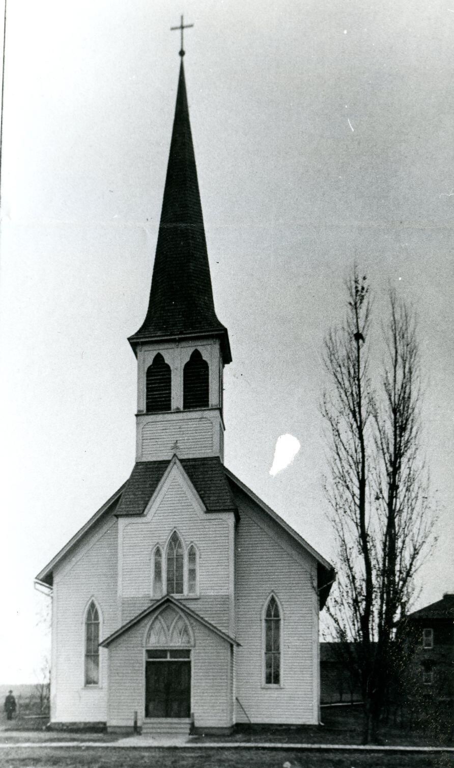 Most Holy Trinity Catholic Church of Fowler original frame building built in 1881. Copy of photo used in Clinton County History (1980) page 572.