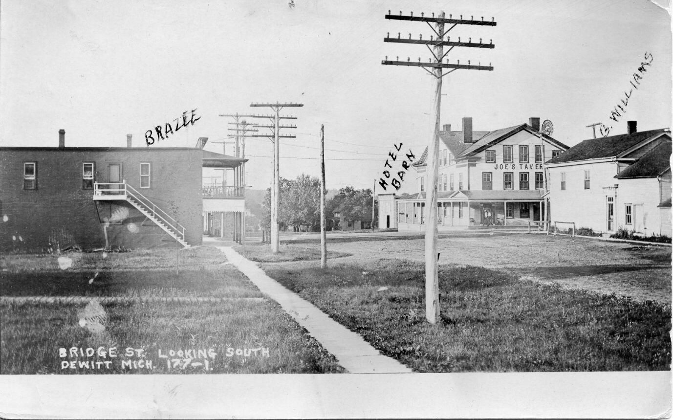 North Bridge Street looking south from Baptist Church showing Brazee Store, William's Store, Joe's Tavern and hotel horse barn.
