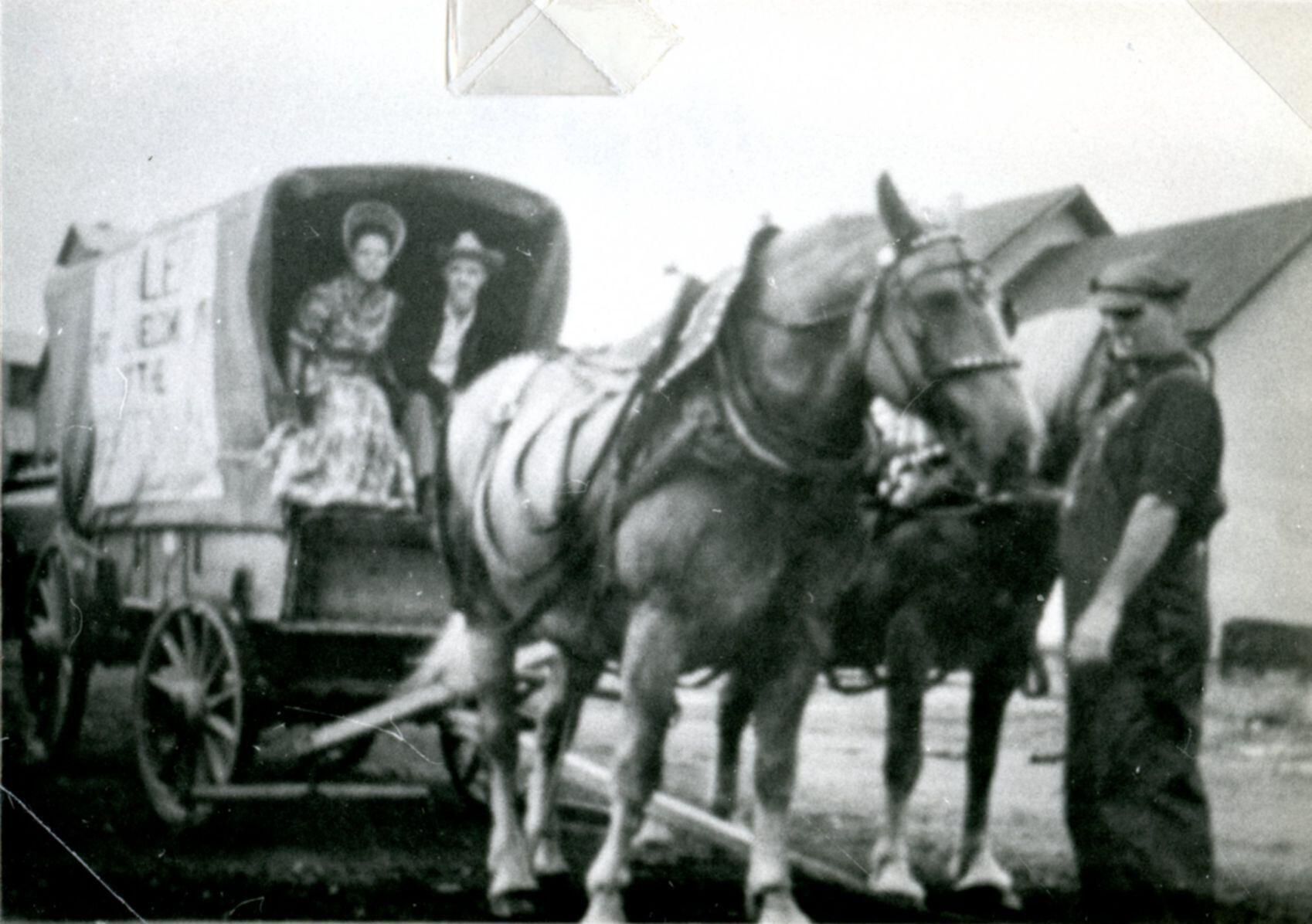 Ed O'Connor team at the Fowler Centennial in August 1957. Pictured are Mr. and Mrs. Lester Chase and Furgus O'Connor. From 1980 History of Clinton County page 216.