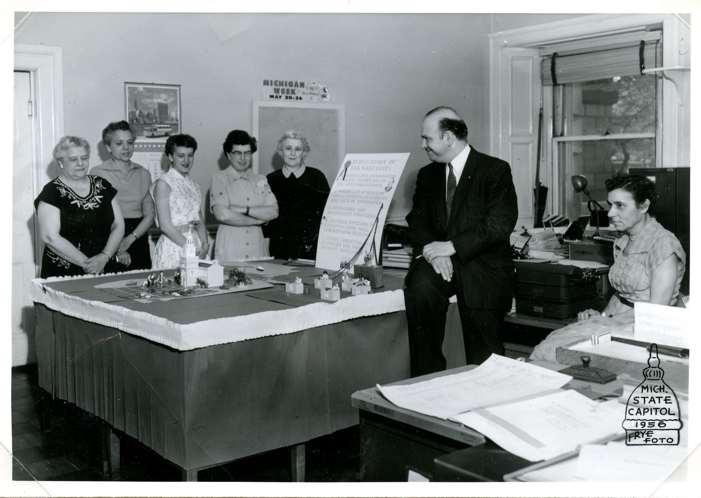 1956 - Ann Sullivan, Ruth Haskin, Sally Brunette, Amy VanDriesen, Clara Whitbeck, Victor Targonski, Gracia Salspaugh. Taken at Michigan State Capitol by Frye Foto. Probably State of Michigan office workers