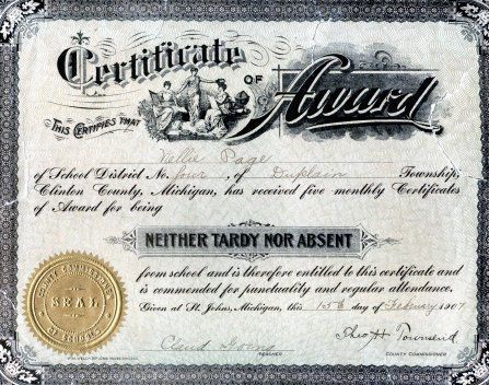 Nellie Page see also A perfect attendance certificate award for Nellie from Duplain Twp. School Dist. 4 15 Feb 1907 Courtesy of Nellie's Grandson, Jack Sheldon [jsheldon12@cox.net]