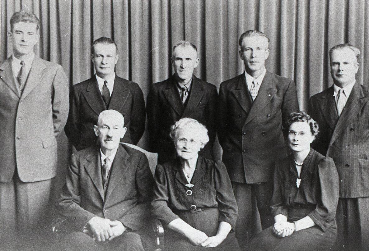 Pasch family in 1946. (back) Edwin, Frederick, Otto, Herbert, Herman, (front) Carl Frederick, Johanna C., Anna Pasch Jackson. Scan of negative from 1980 History of Clinton County page 228.